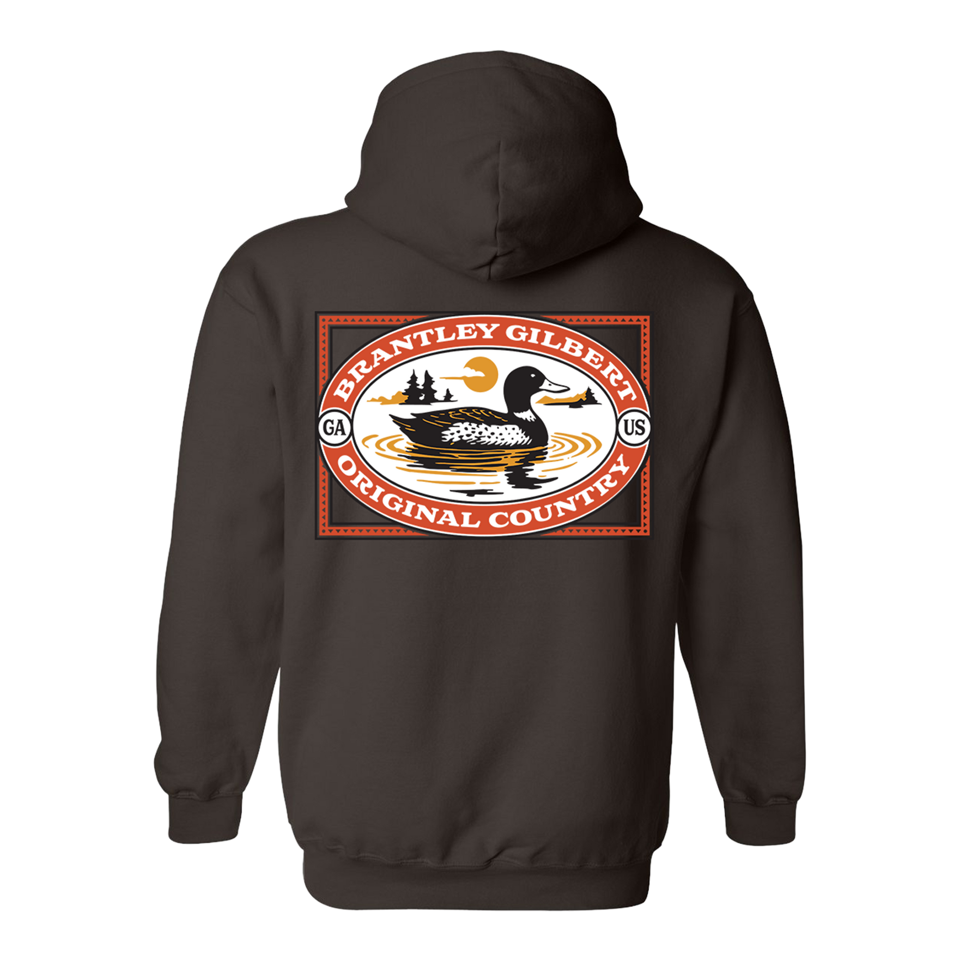 Dark chocolate brown 100% cotton unisex hoodie with vintage style oval badge printed on the front and "Brantley Gilbert - Original Country" oval badge with a duck on a pond illustration on the back.